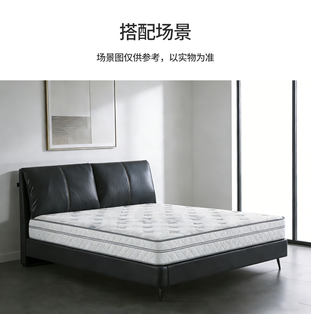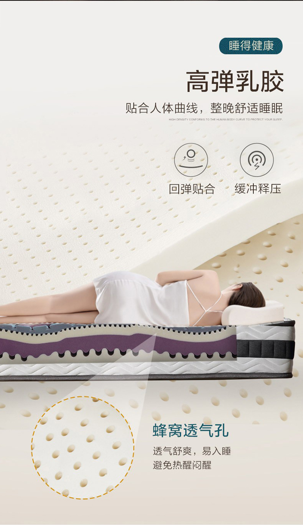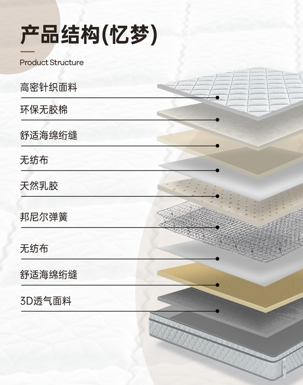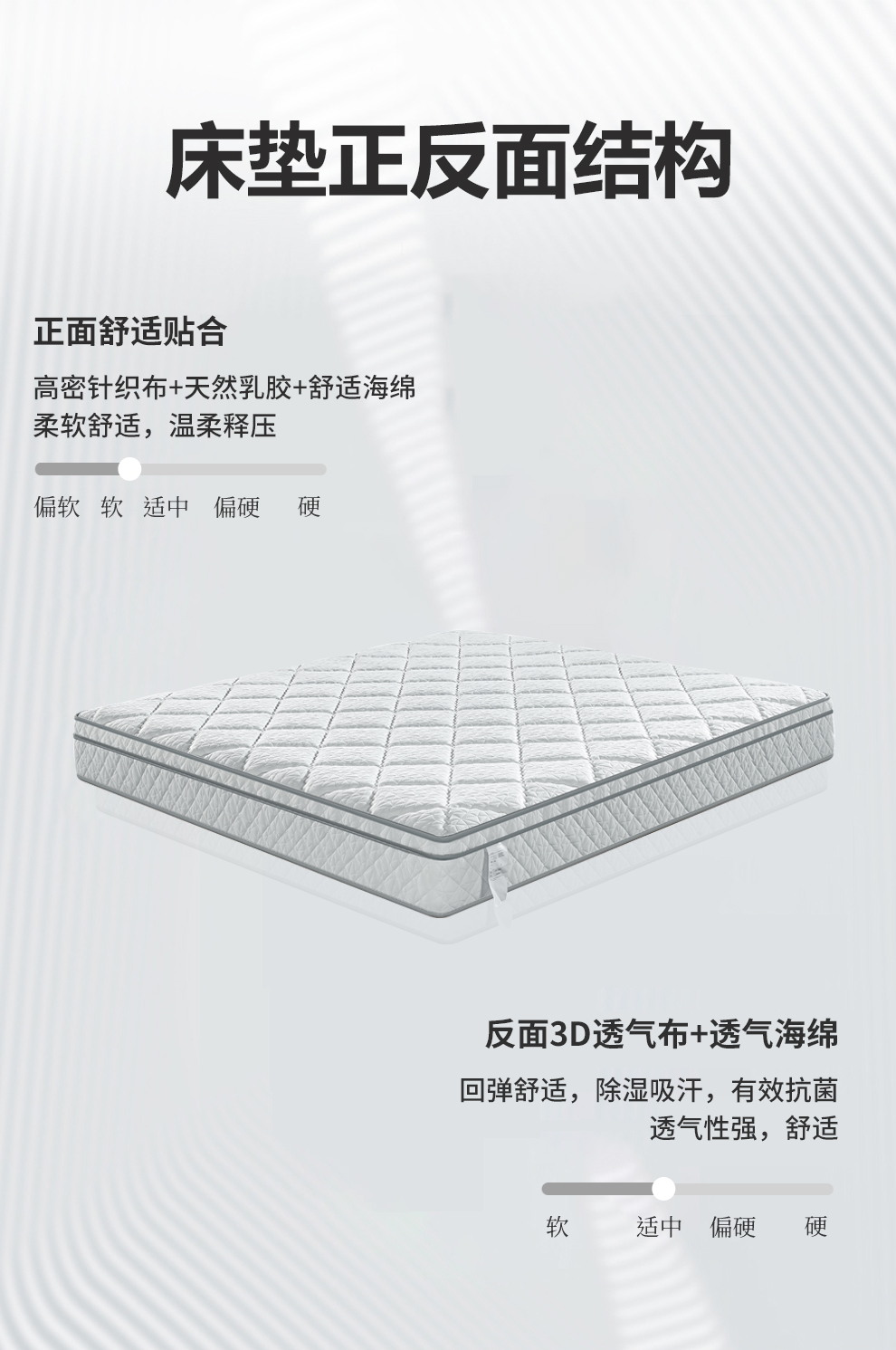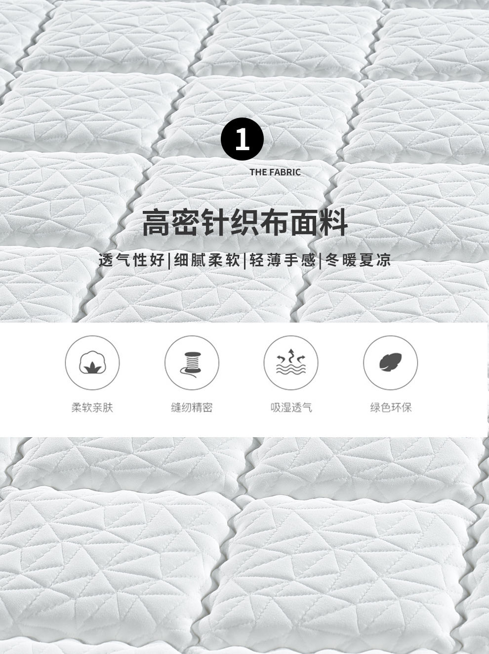 面料:高密针织布 绗缝层:舒适海绵 舒适层:天然乳胶 支撑层:邦尼尔整网弹簧 四周加强护边工艺:支撑海绵 侧面:高密针织布绗缝多孔透气海绵 底面:3D网布+海棉 *不可改色改尺