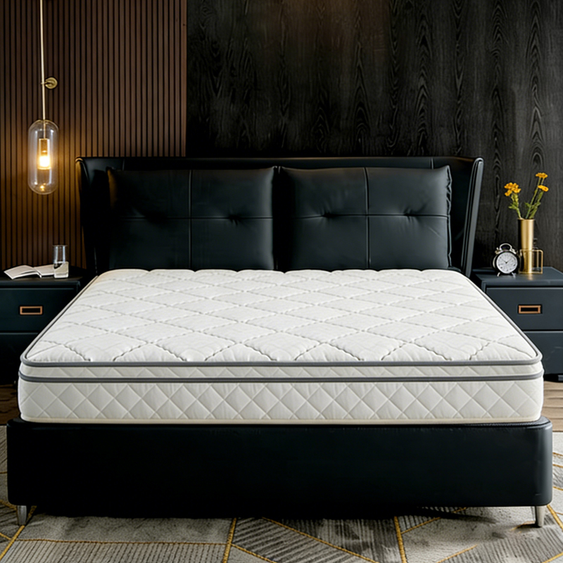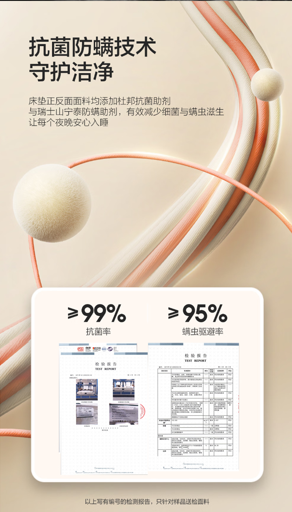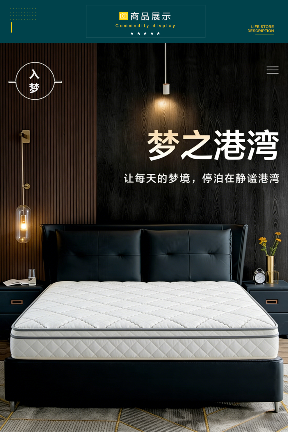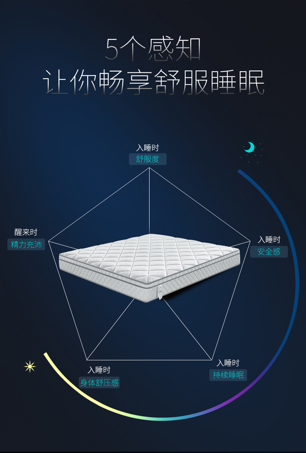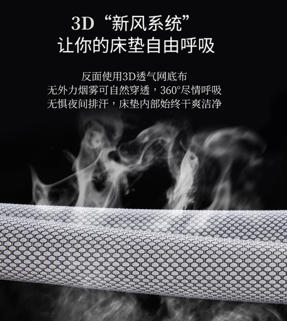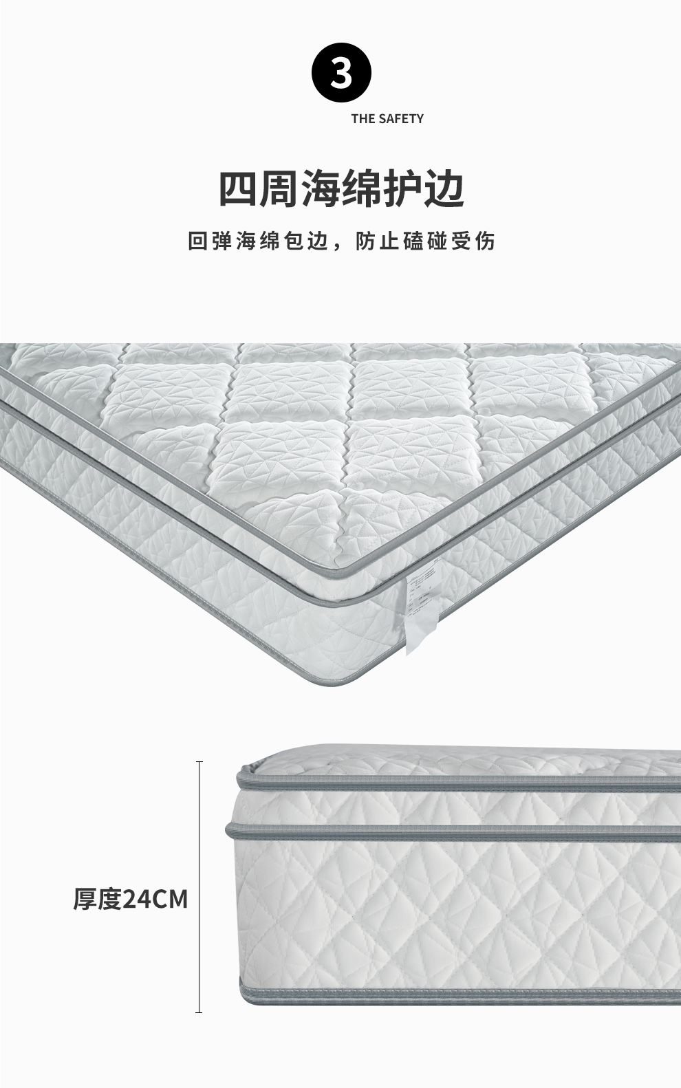 面料:高密针织布 绗缝层:舒适海绵 舒适层:天然乳胶 支撑层:邦尼尔整网弹簧 四周加强护边工艺:支撑海绵 侧面:高密针织布绗缝多孔透气海绵 底面:3D网布+海棉 *不可改色改尺