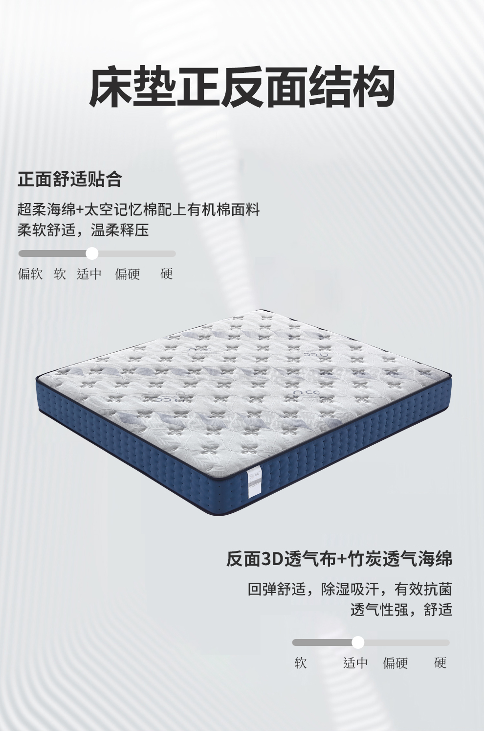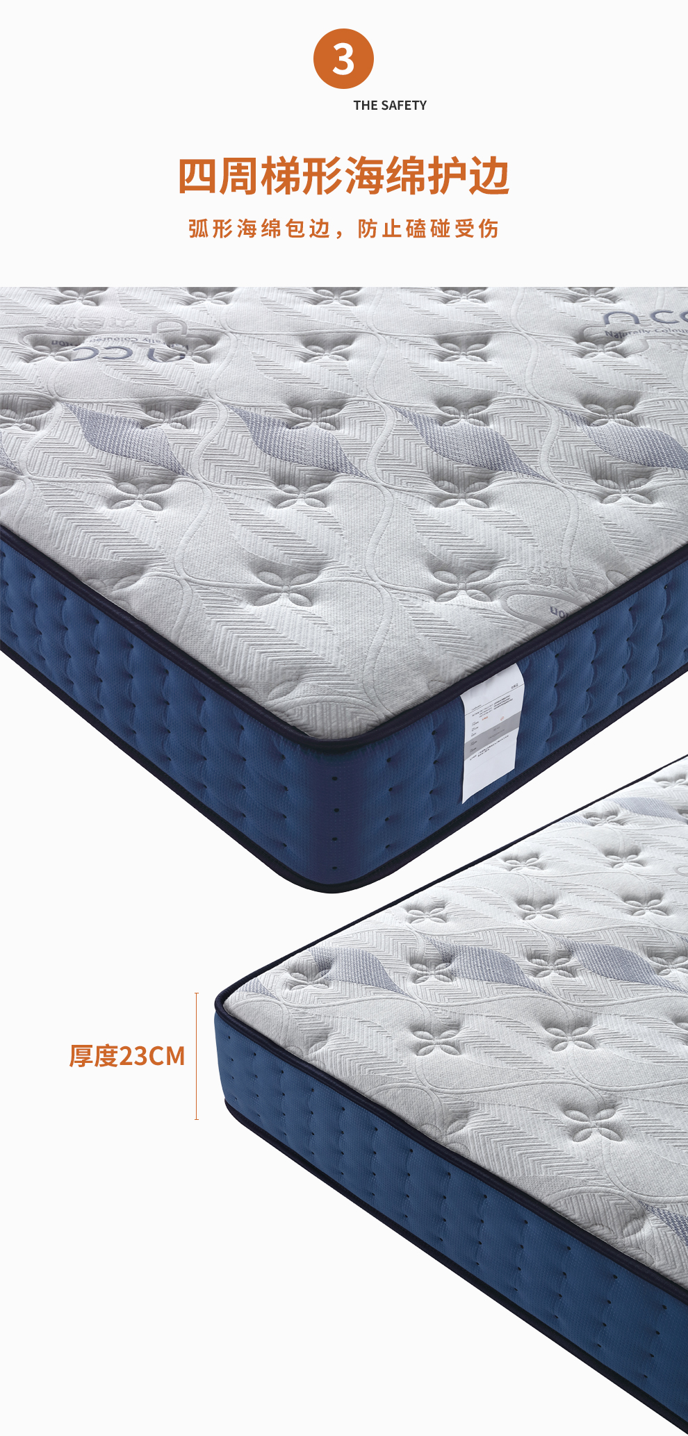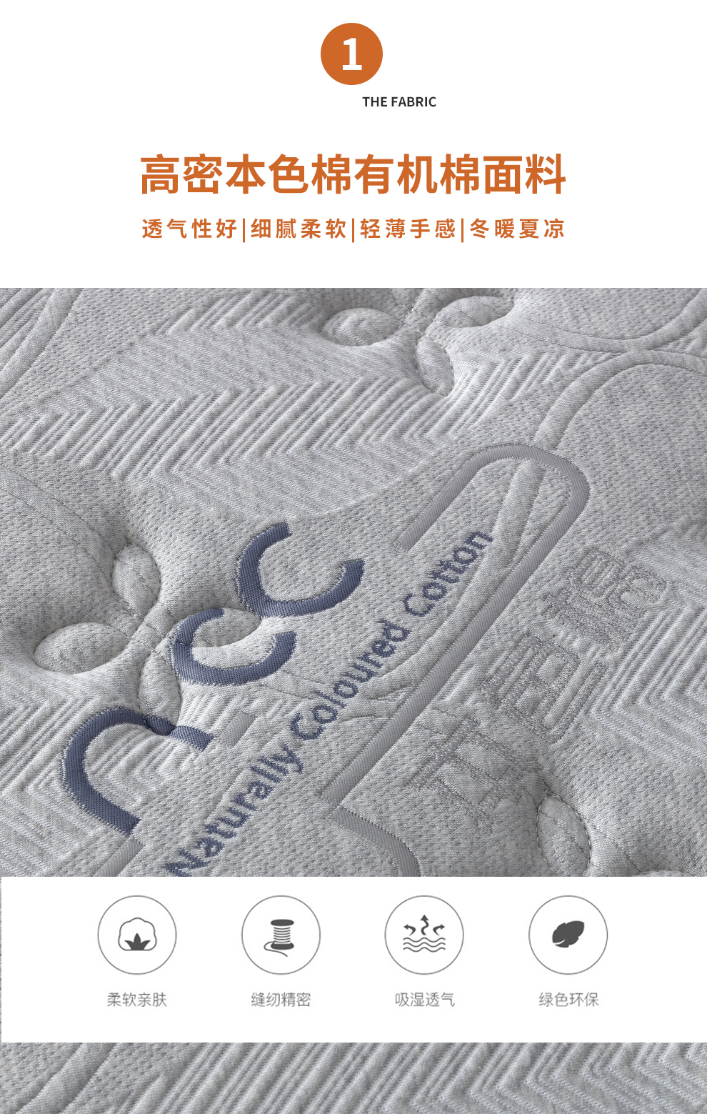 面料:高密本色棉有机棉面料 绗缝层:舒适海绵 舒适层:超柔海绵+太空记忆棉 支撑层:加密独立袋装弹簧 四周梯形海绵护边 侧面:科技绒面料绗缝多孔透气海绵 底面:3D透气布+竹炭透气海绵 *不可改色改尺