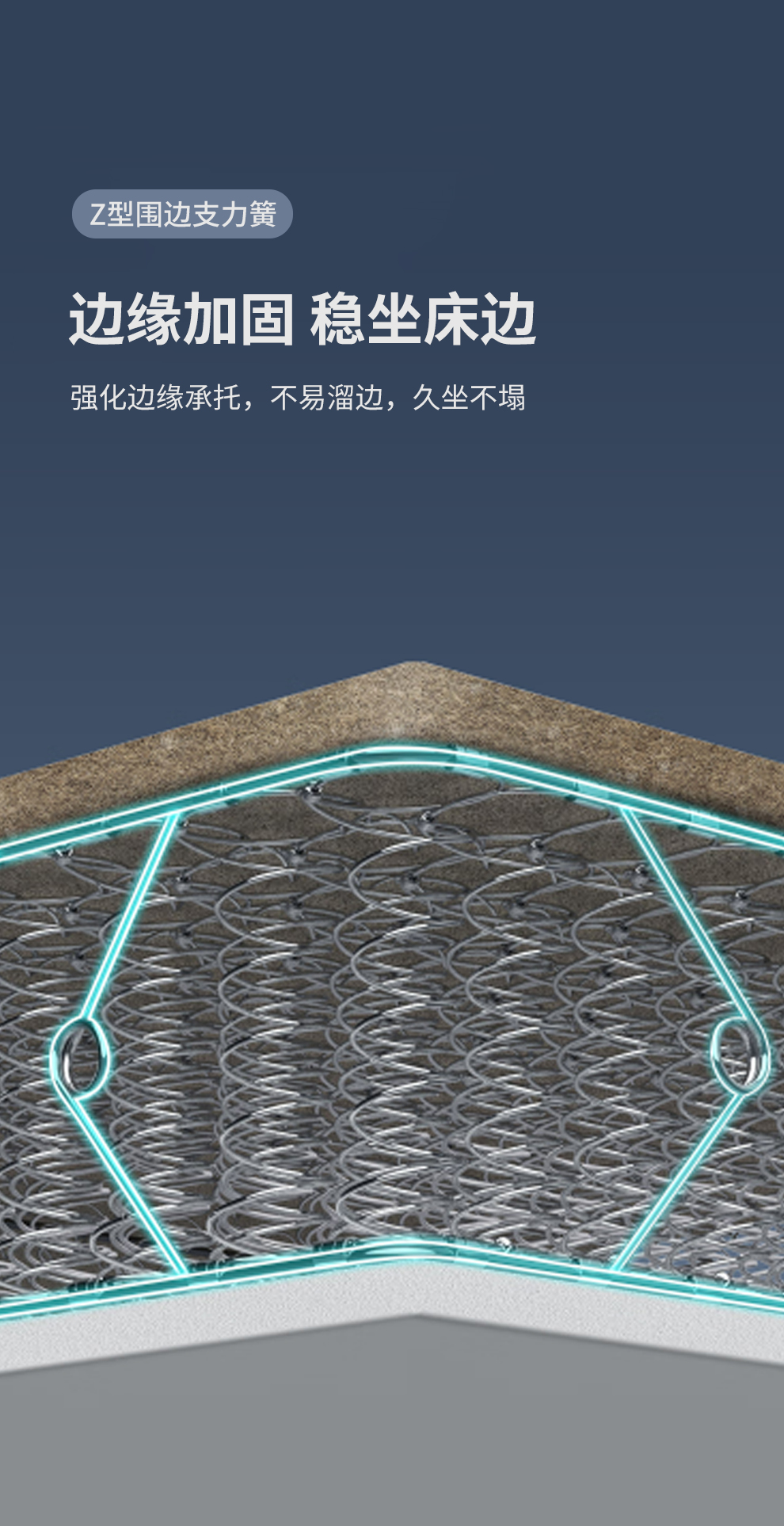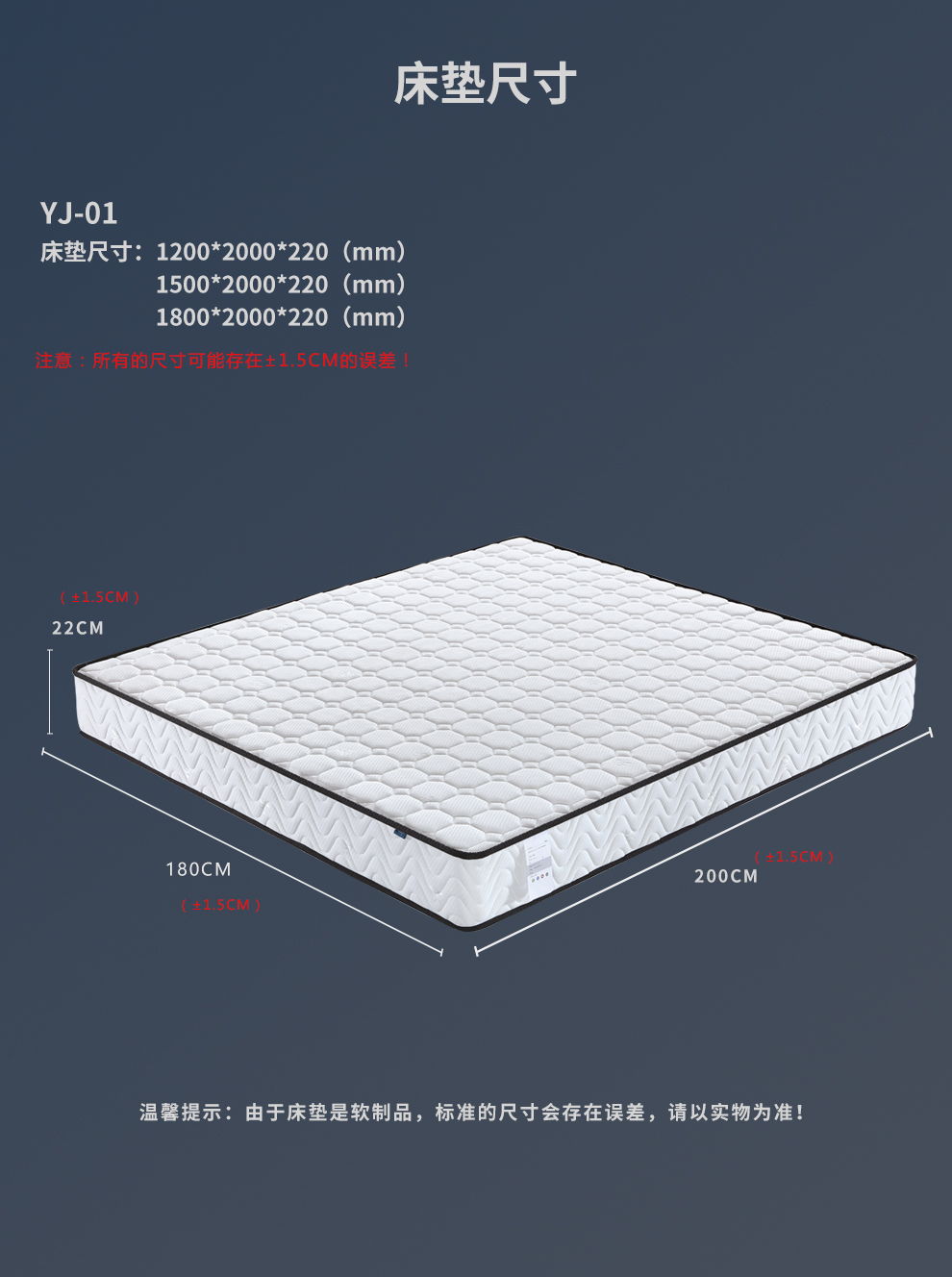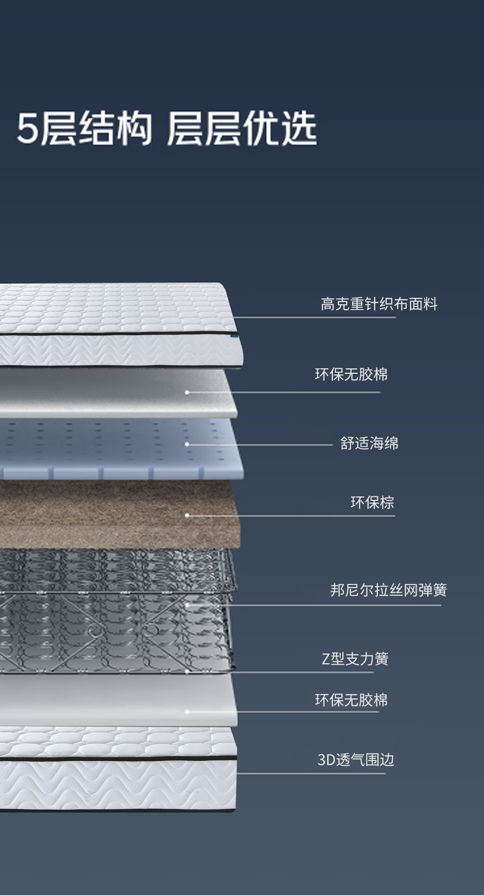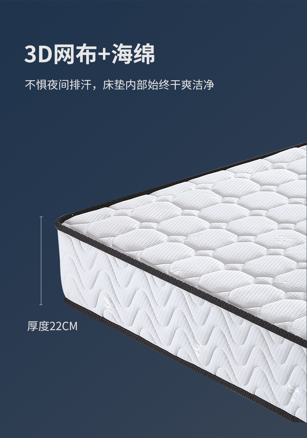 面料:高克重针织布 绗缝层:舒适海绵 支撑层:环保棕+拉丝网弹簧 侧面:针织面料复合多孔透气海绵 底面:3D网布+海棉 *不可改色改尺