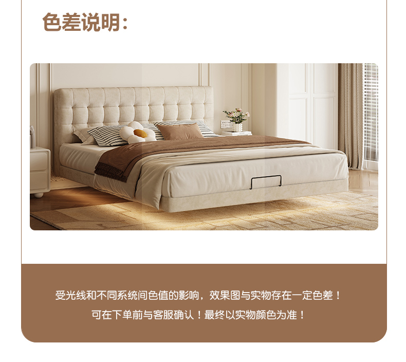 材质:猫抓绒+高密度海绵+实木+钢木排骨架+感应灯带;此链接有两个尺寸,选择其一!可以改色,改色加收¥300;不可以改尺!