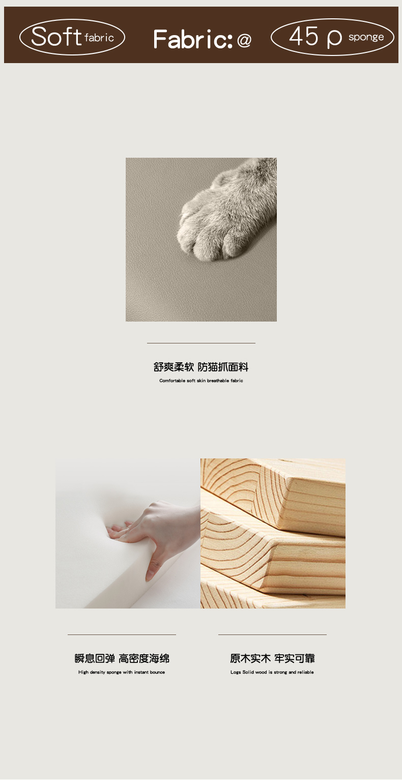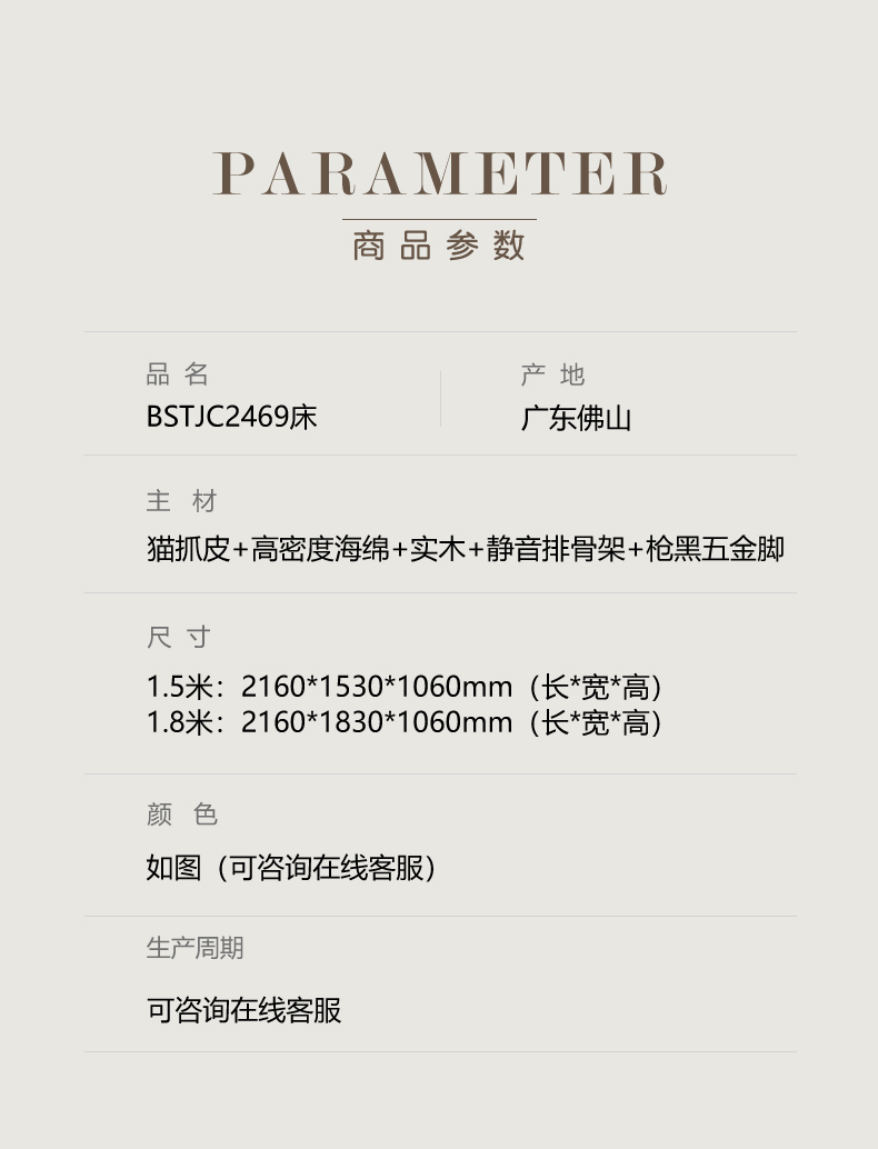 材质:猫抓皮+高密度海绵+实木+5D实木静音排骨架+枪黑五金脚;此链接有两个尺寸,选择其一!可以改色,改色加收300元,不可以改尺!