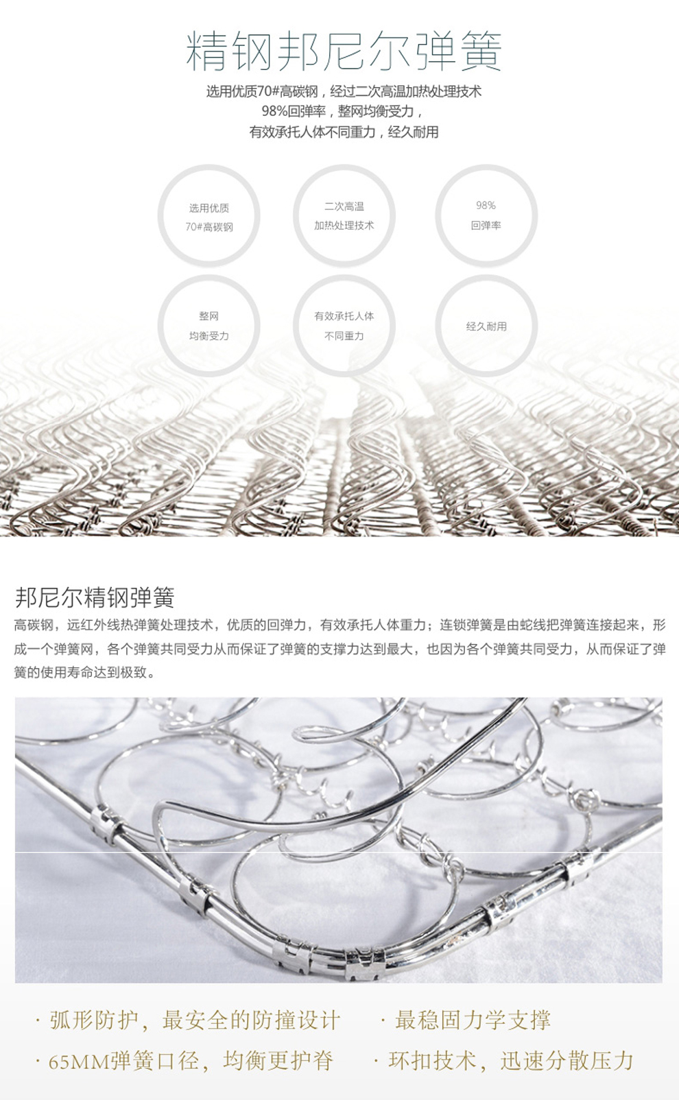 面料:高密针织布 绗缝层:舒适海绵 舒适层:天然乳胶 支撑层:邦尼尔整网弹簧 四周加强护边工艺:支撑海绵 侧面:高密针织布绗缝多孔透气海绵 底面:3D网布+海棉 *不可改色改尺
