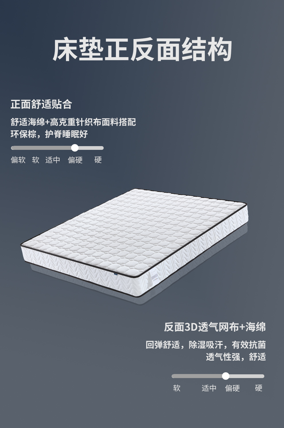 面料:高克重针织布 绗缝层:舒适海绵 支撑层:环保棕+拉丝网弹簧 侧面:针织面料复合多孔透气海绵 底面:3D网布+海棉 *不可改色改尺